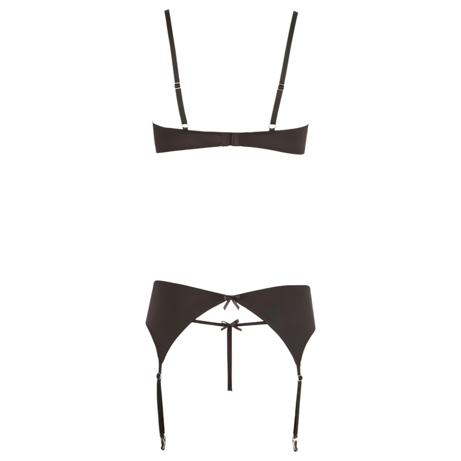 Ziehe den Bügel-BH mit verstellbaren Trägern an, der die Brüste hebt und betont. Ergänze das Set mit dem offenen Tanga und befestige den Strumpfhalter mit deinen Lieblingsstrümpfen. Du wirst sofort den besonderen, sinnlichen Effekt spüren.