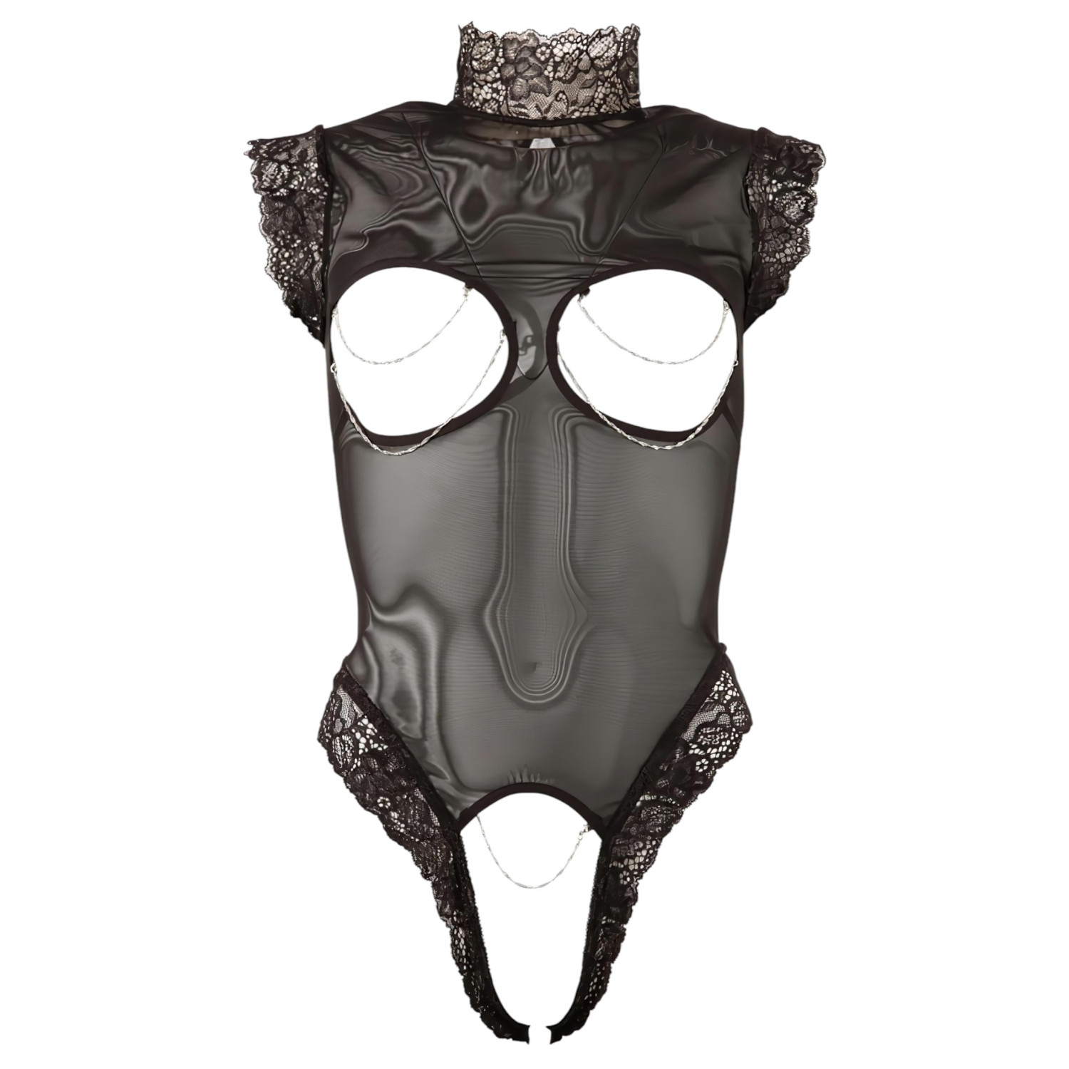 Dieser spezielle offene Body ist zugleich elegant und berauschend erotisch. Die Spitzendetails verleihen eine feminine Raffinesse, während das transparente Material und die abnehmbaren Kettenapplikationen für ein unvergessliches Erlebnis sorgen.