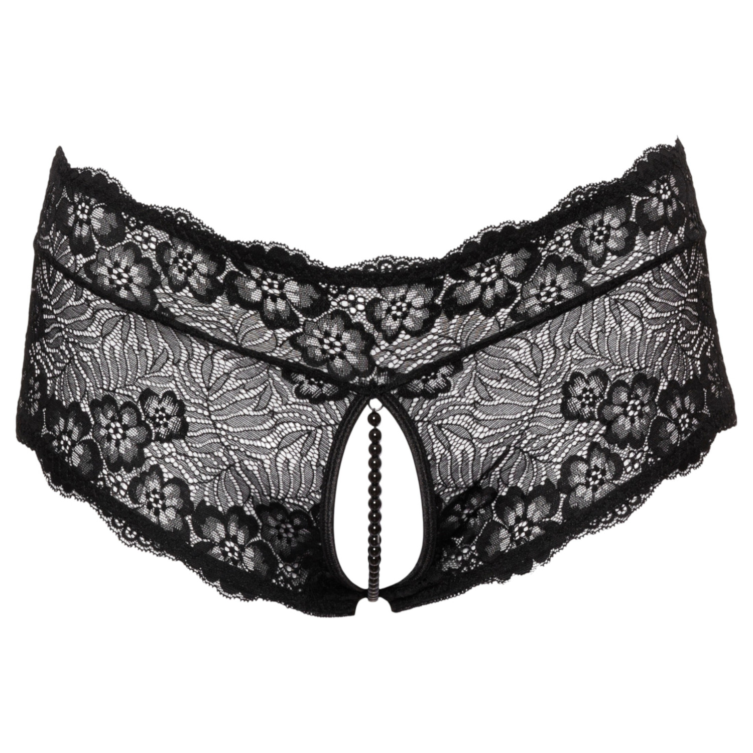 Das Cottelli Curves – offene Spitzenhöschen (schwarz) besteht aus feiner, blumengemusterter Spitze und bietet ein äußerst verführerisches Design mit einer offenen Gestaltung und einer stimulierenden Perlenkette, die sofort eine aufregende Atmosphäre schafft.