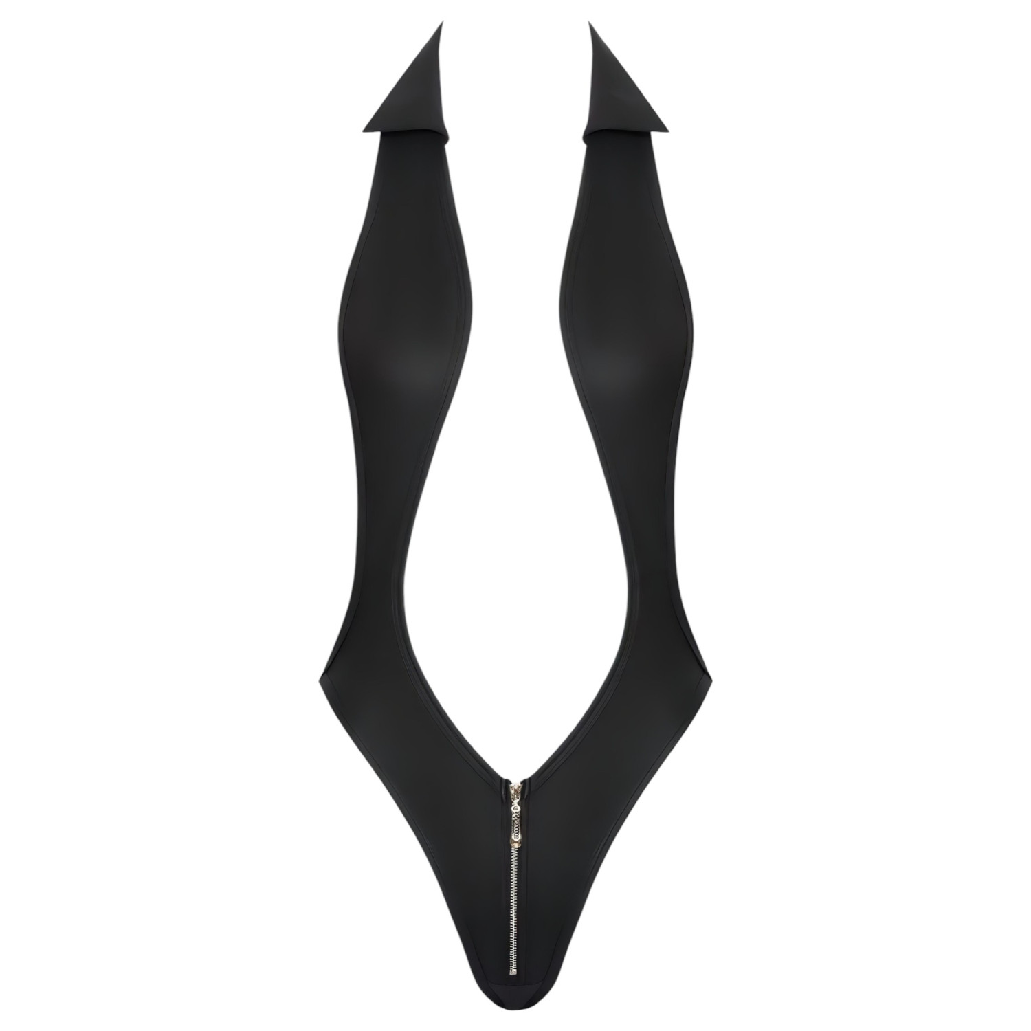 Glänzender, sexy Body mit extra tiefem Dekolleté, am Po nur mit ein paar elastischen Bändern und einem eleganten Kragen!