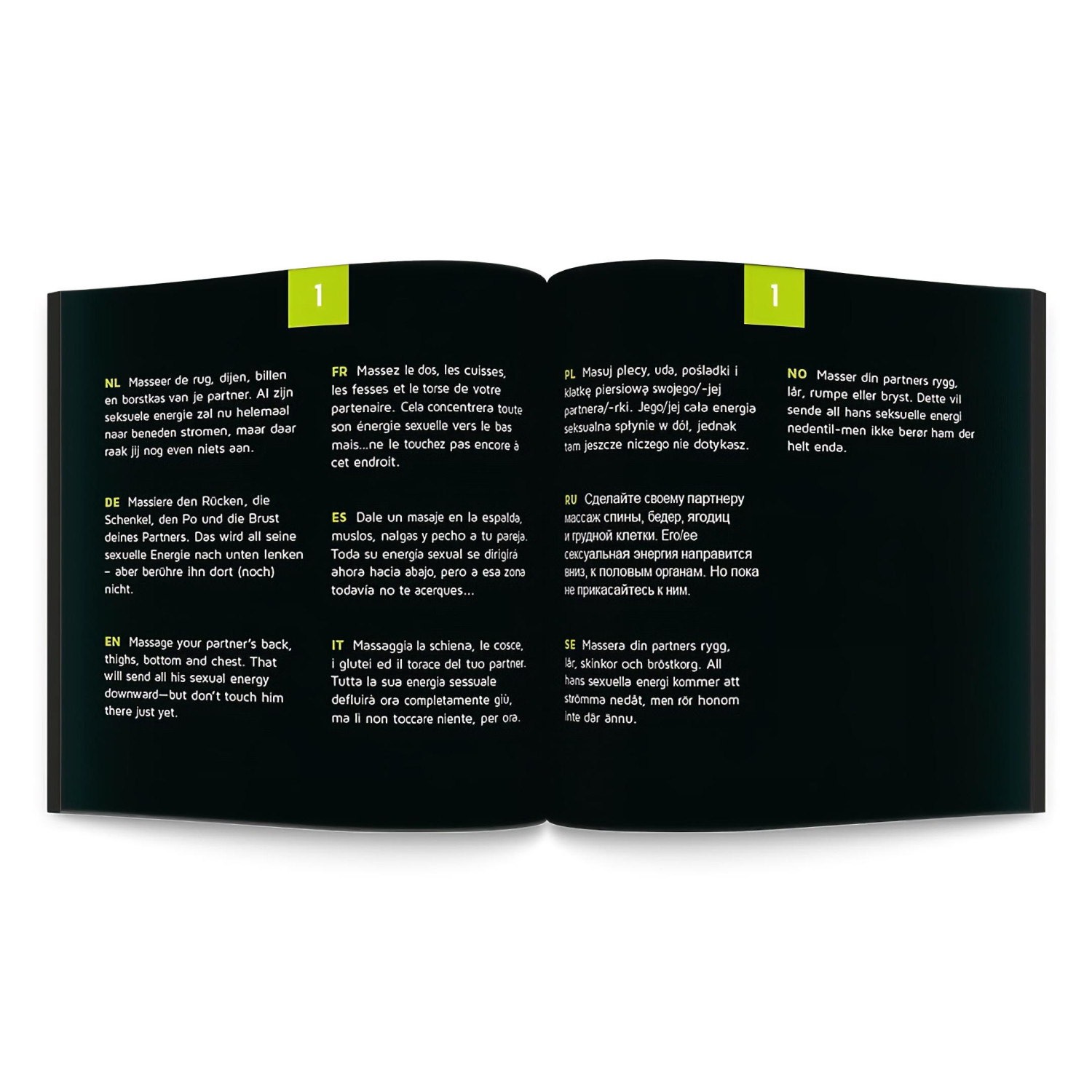 Mit nur einem Dreh könnt ihr herausfinden, welche erotische Herausforderung euch erwartet! Der Pfeil auf dem Spielbrett zeigt eine Zahl an, zu der jeweils eine Aufgabe gehört. Die Edition „Vorspiel“ enthält 24 verschiedene Aufgaben, die in 10 Sprachen verfügbar sind - so erlebt ihr immer wieder etwas Neues und Aufregendes zusammen.