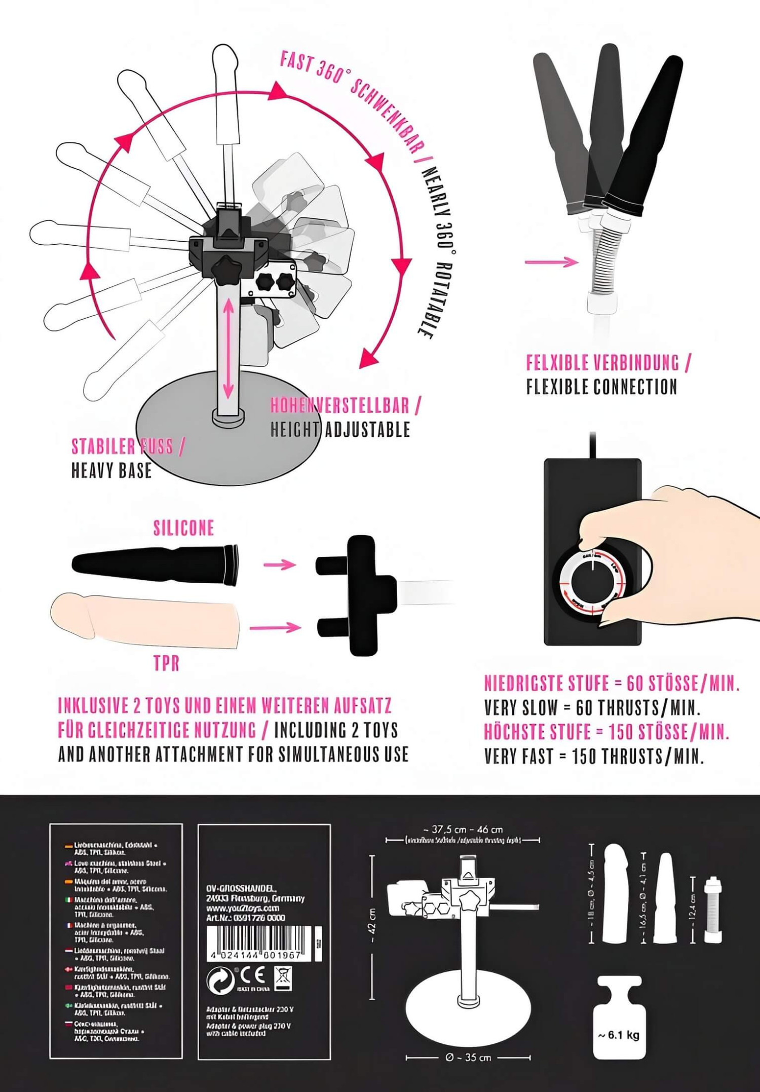 • Material: rostfreier Stahl, ABS, TPR, Silikon (phthalatfrei, EU-konform)